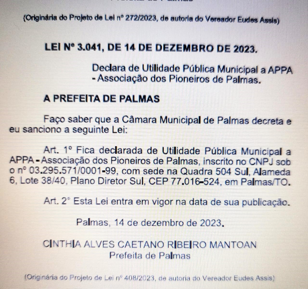 APPA - Utilidade Pública Municipal - PALMAS TO Lei 3.041 de 14 de dezembro de 2023 _ APPA _ recebe o titulo de Utilidade Pública Municipal - Sancionada pela Prefeita Cinthia Ribeiro tendo como autor Vereador Eudes Assis Baixar